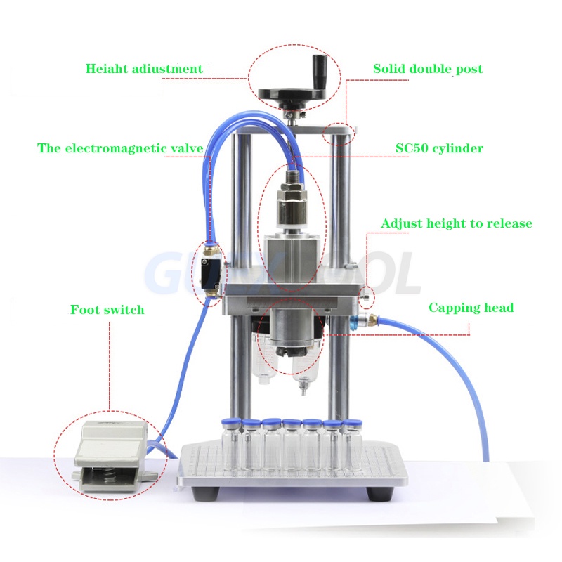 7. Suitable for crimping vial bottle and antibiotic bottle caps, it uses the crimping head to crimp the cap, and fix tightly on the bottle mouth.