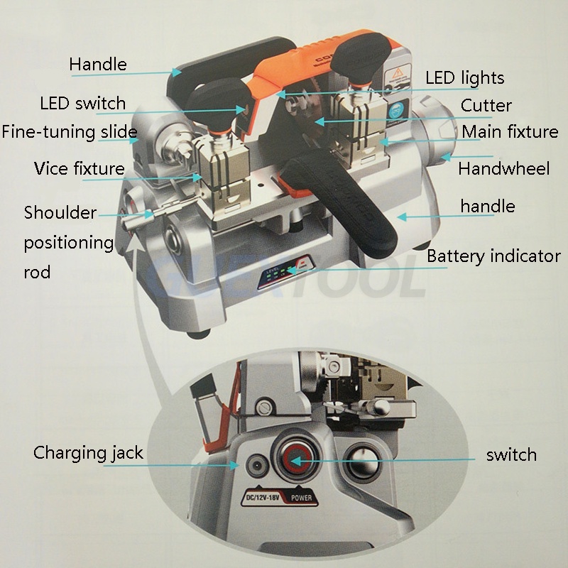 Product specification Product name:Portable XC009 Manual Horizontal key Machine (Without batteries) Spindle speed: 1800rpm Fixture spacing: 95mm Working temperature: 0~50° Working temperature: 10-90% Machine size: 285*175*180mm Rated power: 200W Power parameters: 12~18V/3A Maximum output torque: 1.2Nm