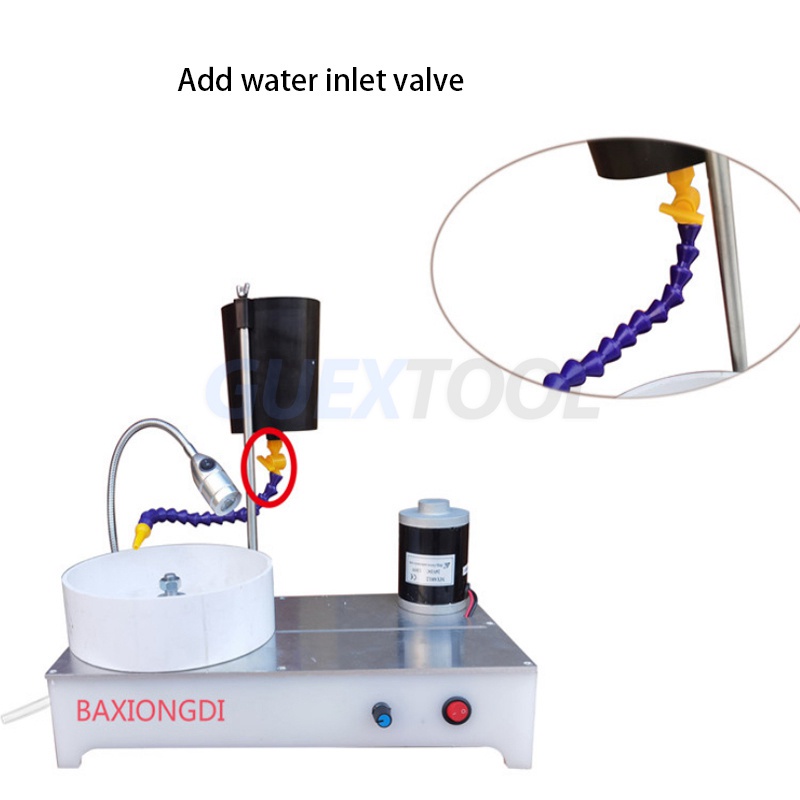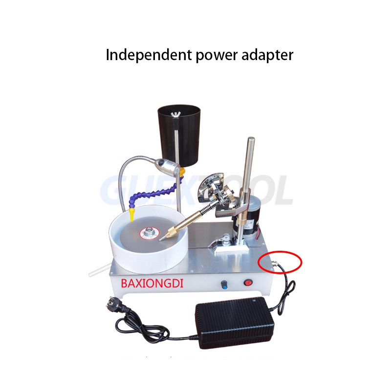 Product parameters Name: Precision Benchtop Grinder Voltage: 110-240V to DC24V Speed: 2800 rpm Power: 120W Can be assembled: inner hole 12.7mm Diameter: 6"-7" (150-180mm) Machine size: 40cmx20cmx32cm Package size: 46.5x39x23.5CM Weight: 9kg Note: The randomly assigned power adapter can be connected to 110-240V AC, and the power adapter will output 24V DC through voltage transformation. 24V DC is supplied to the motor and lighting through the power switch. Effectively prevent the danger of high voltage leakage. Machine matching list: 1 host 1 single fork manipulator 1 water baffle 1 aluminum chassis 1 diamond grinding disc 1 work light 1 water cup 1 universal water pipe 1 drain pipe 3 sticks 1 power adapter