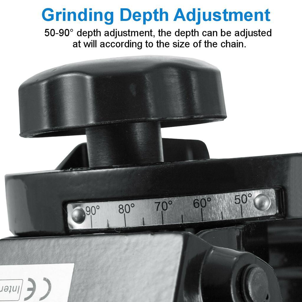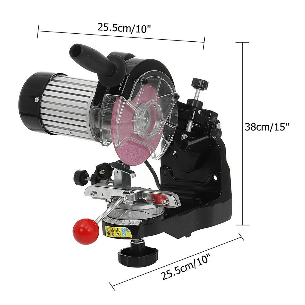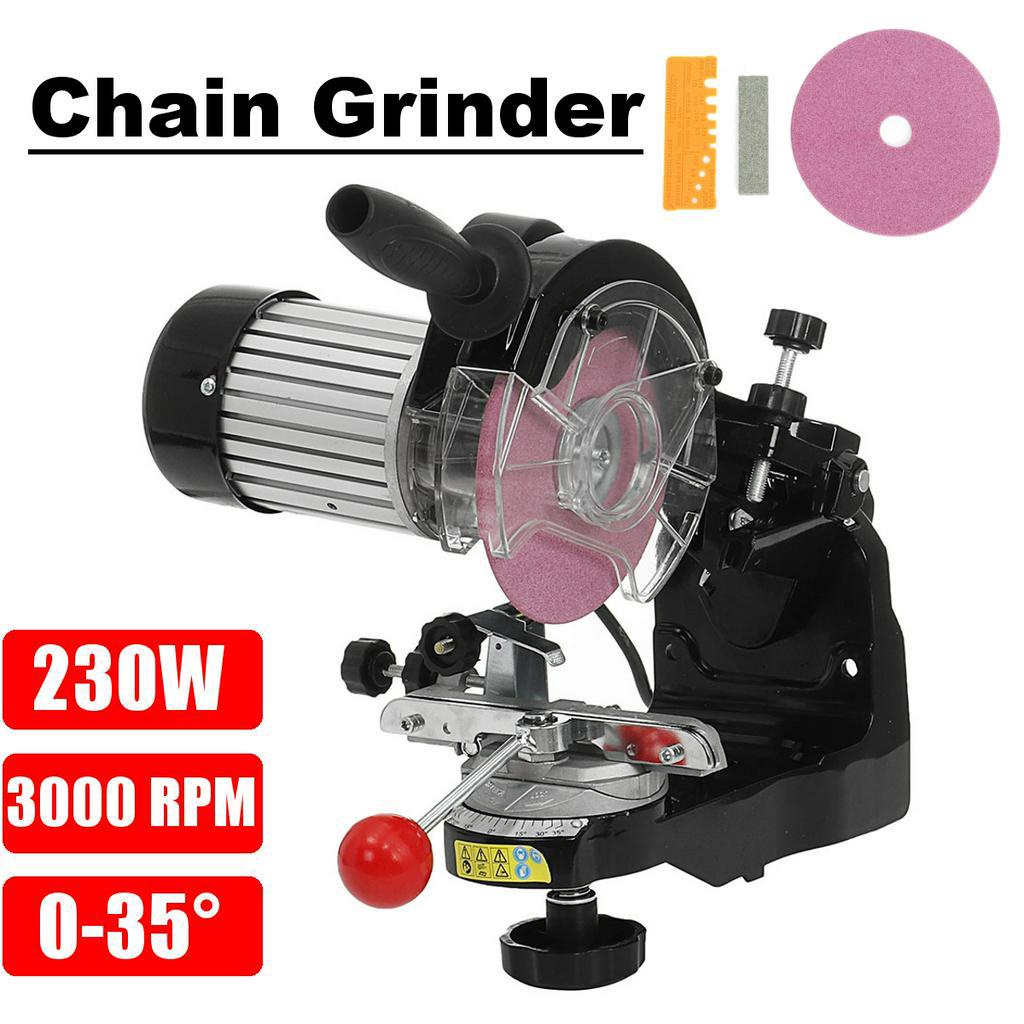 The adjustable angle and large handle allow easy operation. Sharpens chains from 1/4in to 3/8in pitch. motor operates at 3000 RPM. 230 Watt motor input power. It includes lamp and disc guards and two grinding discs at 1/8in, 3/16in.