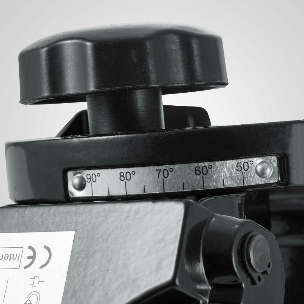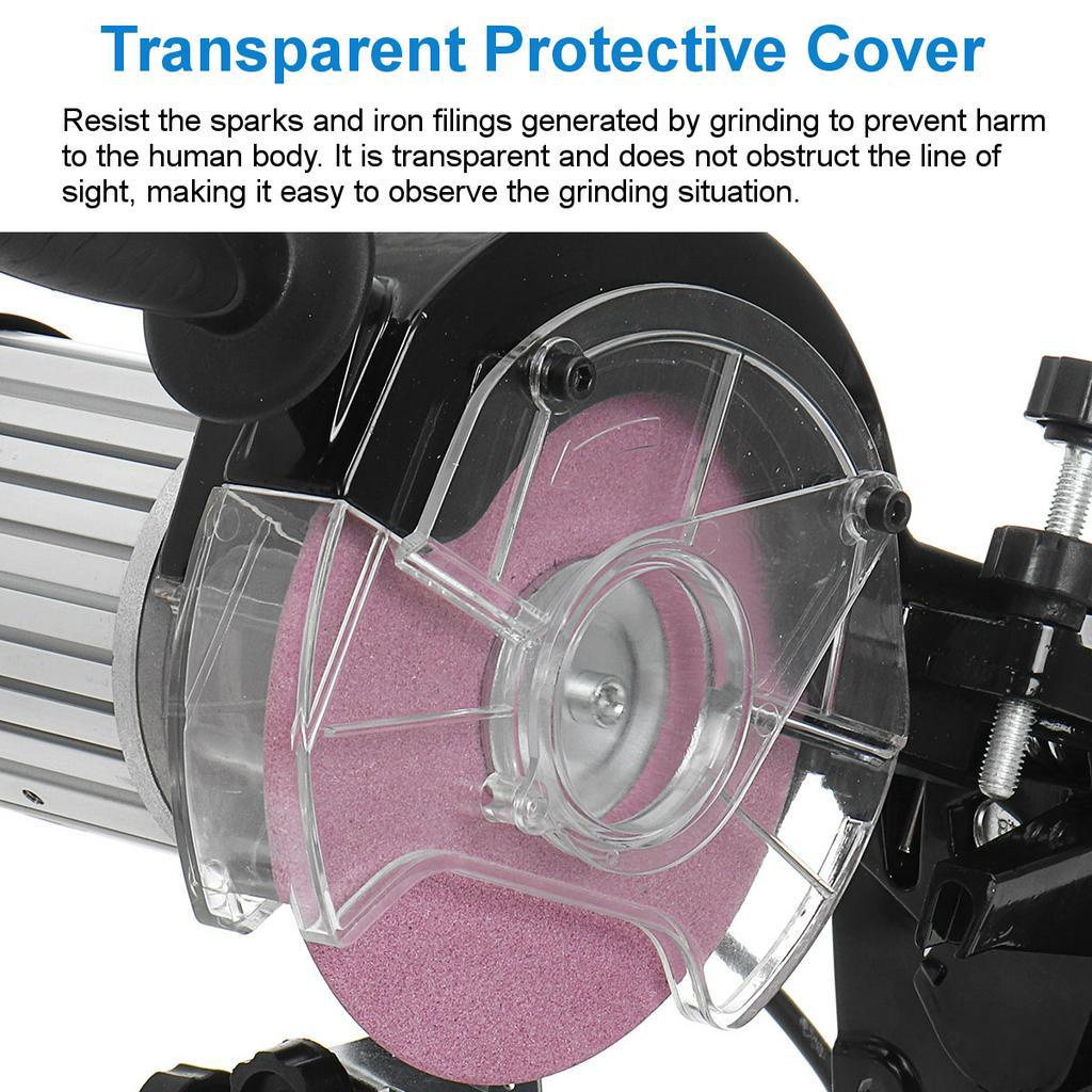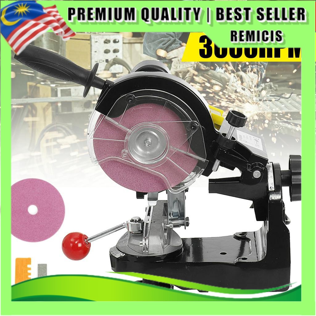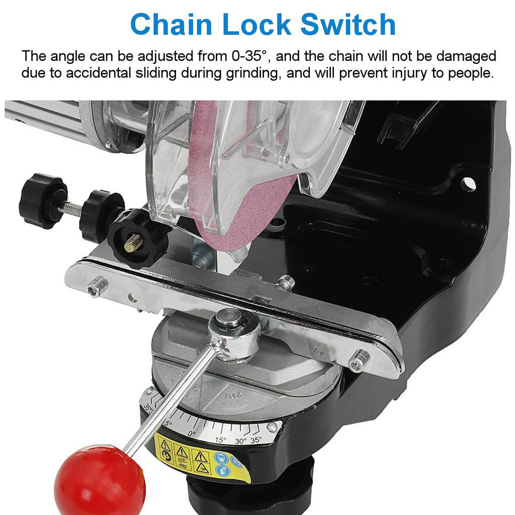 The adjustable angle and large handle allow easy operation. Sharpens chains from 1/4in to 3/8in pitch. motor operates at 3000 RPM. 230 Watt motor input power. It includes lamp and disc guards and two grinding discs at 1/8in, 3/16in.