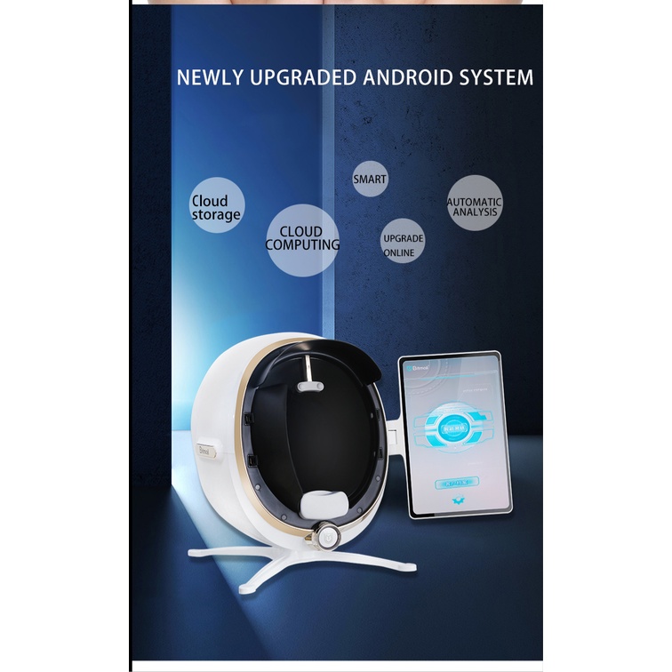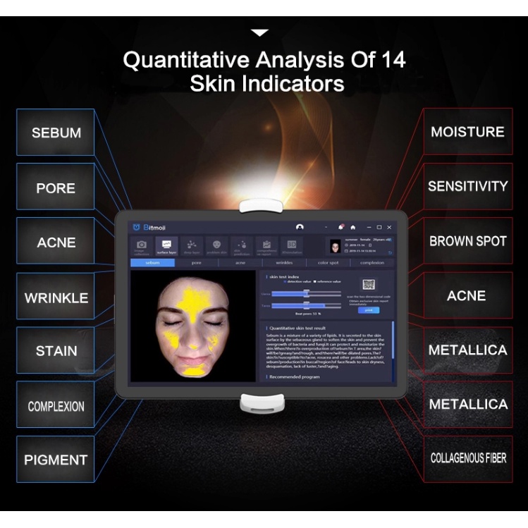 Through 28 million hd pixels to obtain facial skin image conditions, using 8 spectral imagingtechnology, AI face recognition technology, deep learning technology, 3D simulation technology, cloud computing cloud storage, the pathological features of the skin are quantitatively analyzed on the surface and deep layer , and 14 skin health indicators can be detected. Comprehensively analyze and evaluate skin problems, so as to carry out scientific and accurate skin management with reasonable basis!