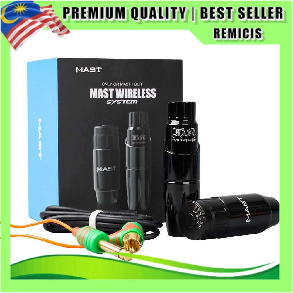 The kit includes a mast tour rotary tattoo machine and a mast wireless battery