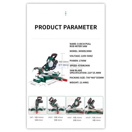Name: 8-inch pull rod miter saw Model: MODEL9086 Voltage: 220V-50Hz Power: 1700W Speed: 4700R/min Saw blade specification: 210*25.4mm Packing size: 790*460*355mm Weight: 13.44kg