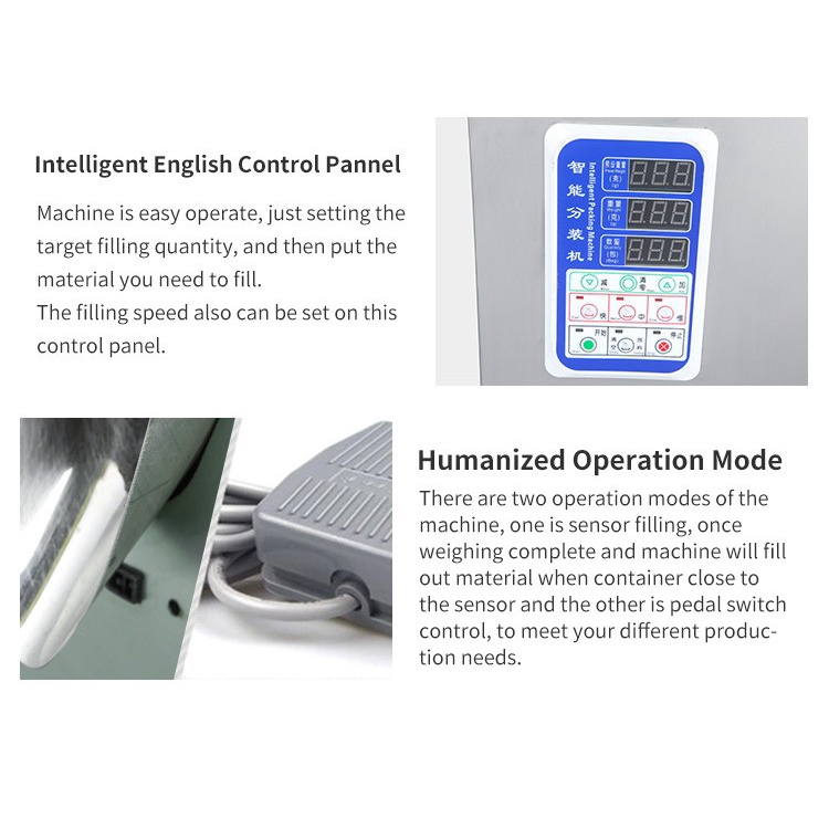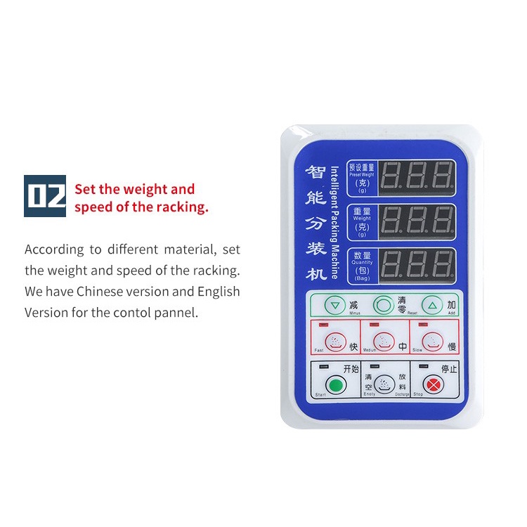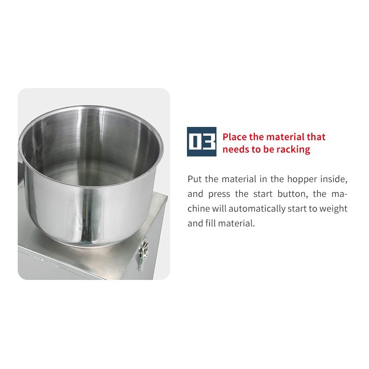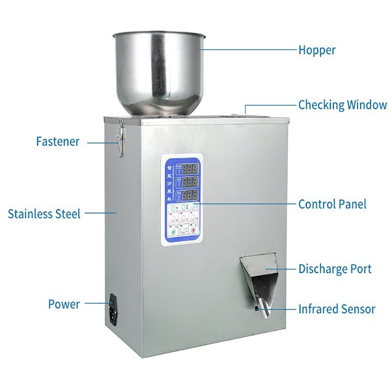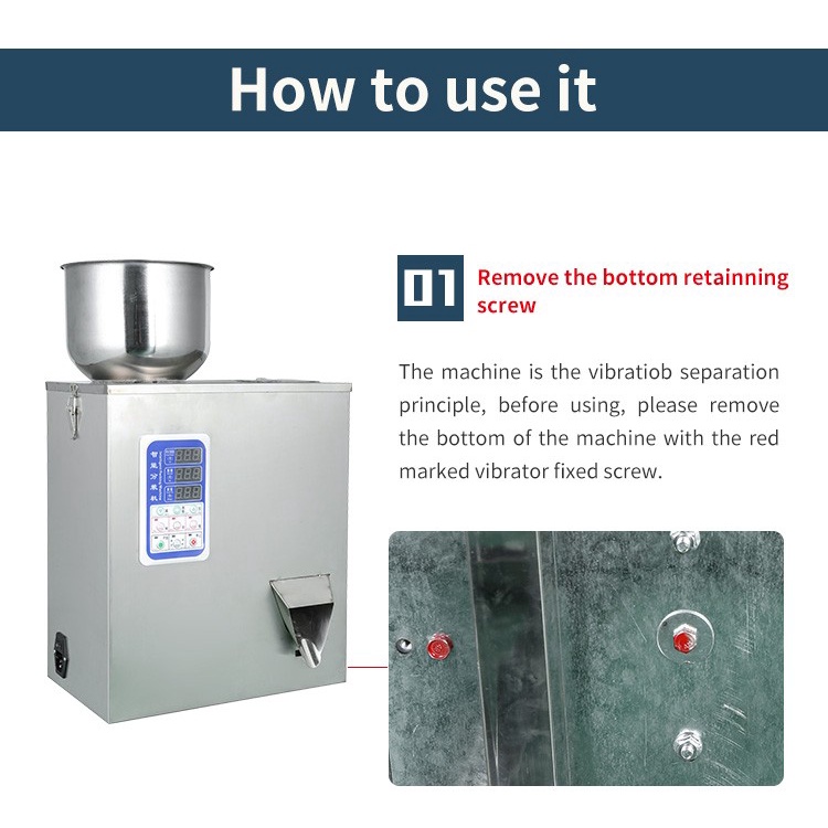 Product parameter Granules 50g Size: 38*24*49cm Power: 100w Error: +0.2 grams (depending on the product) Packing range: pellets, tea, etc. Granules 100g Power: 100w Granules 200g Power: 200w
