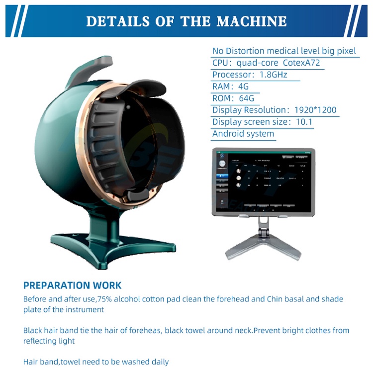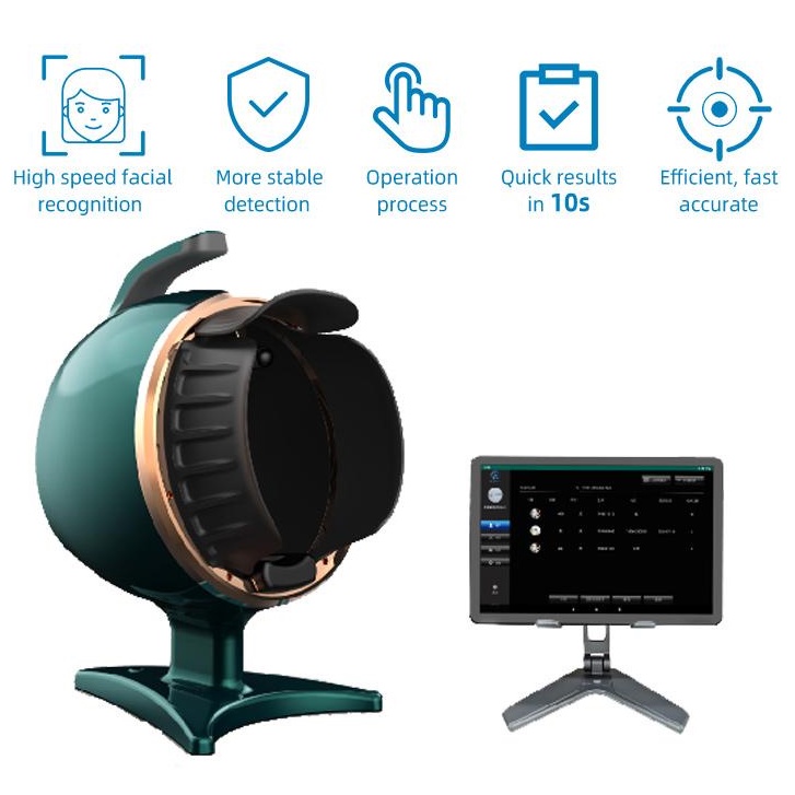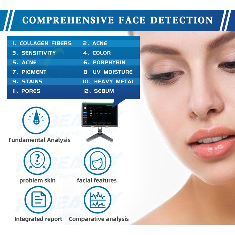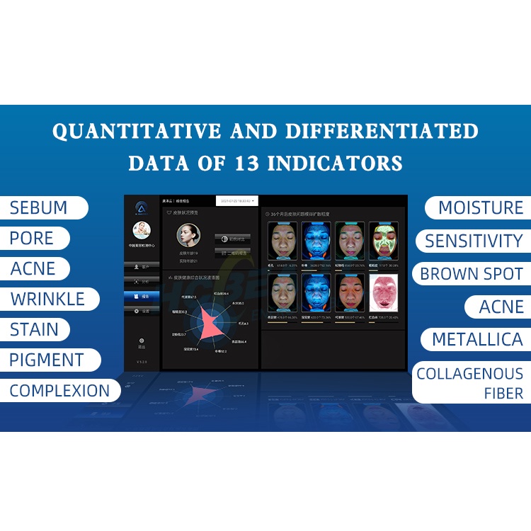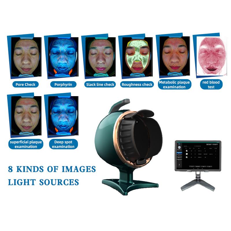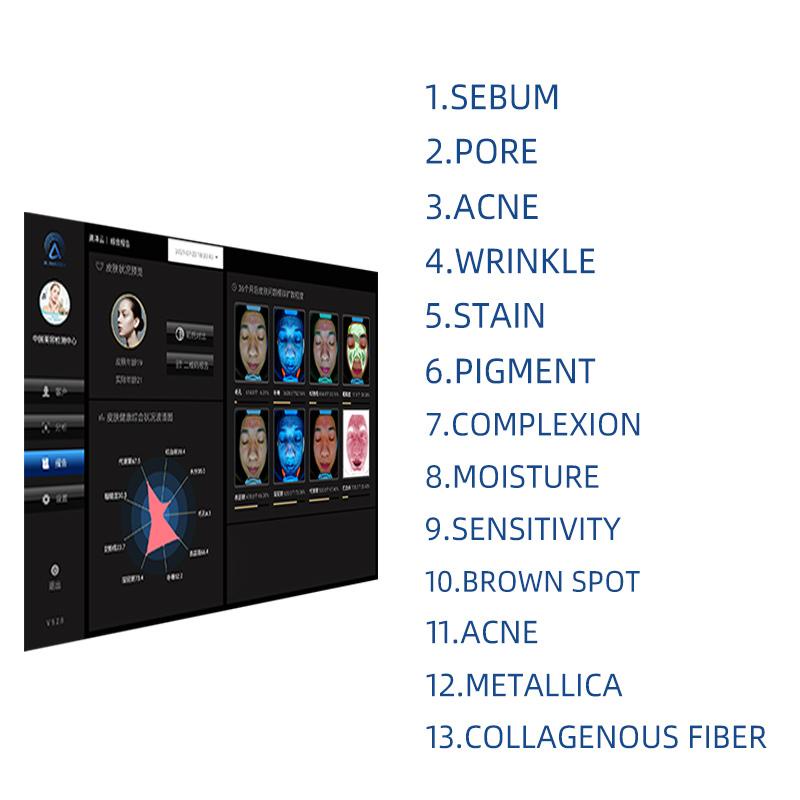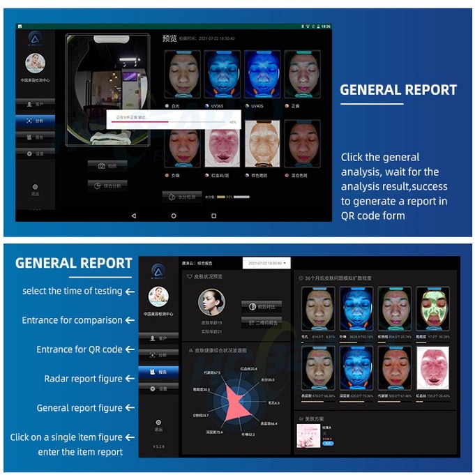 Intelligent skin analysis instrument utilizes face recognition technology, multispectral imaging technology and computing to capture facial images. With hundreds of thousands of medical database, analysing facial images, the probelms of skin especially the base can be found and predicted, providing digitalizing report. So according to the symptoms of report,our skin management practitioners can identify the problems quickly and make a skin treatment plan for our customers.