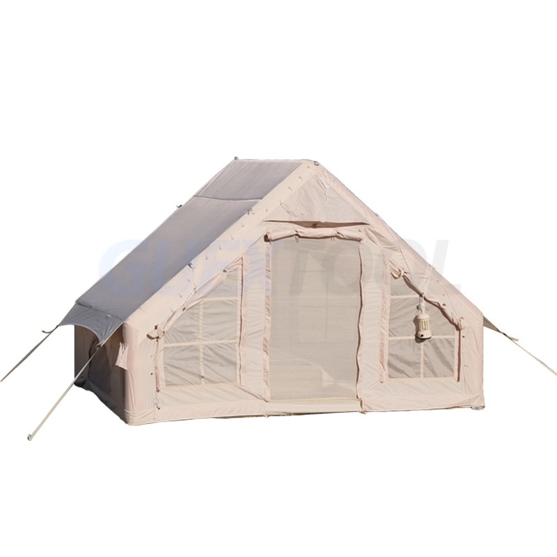 Product parameters Specification: 3 * 2.1 * 0.85 * 2.1 Outer fabric: blended cotton fabric or 420D coated Oxford fabric Floor cloth: Khaki double-sided PVC cloth Air column: double-sided PVC Khaki mesh air tight cloth Mesh: Dense high-strength mosquito proof mesh Packaging size: 45 * 55 * 85cm Weight: approximately 27kg (including packaging and pump) Accessories: 1 air pump, 6 floor nails, and 6 wind ropes