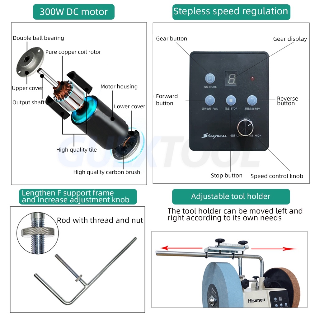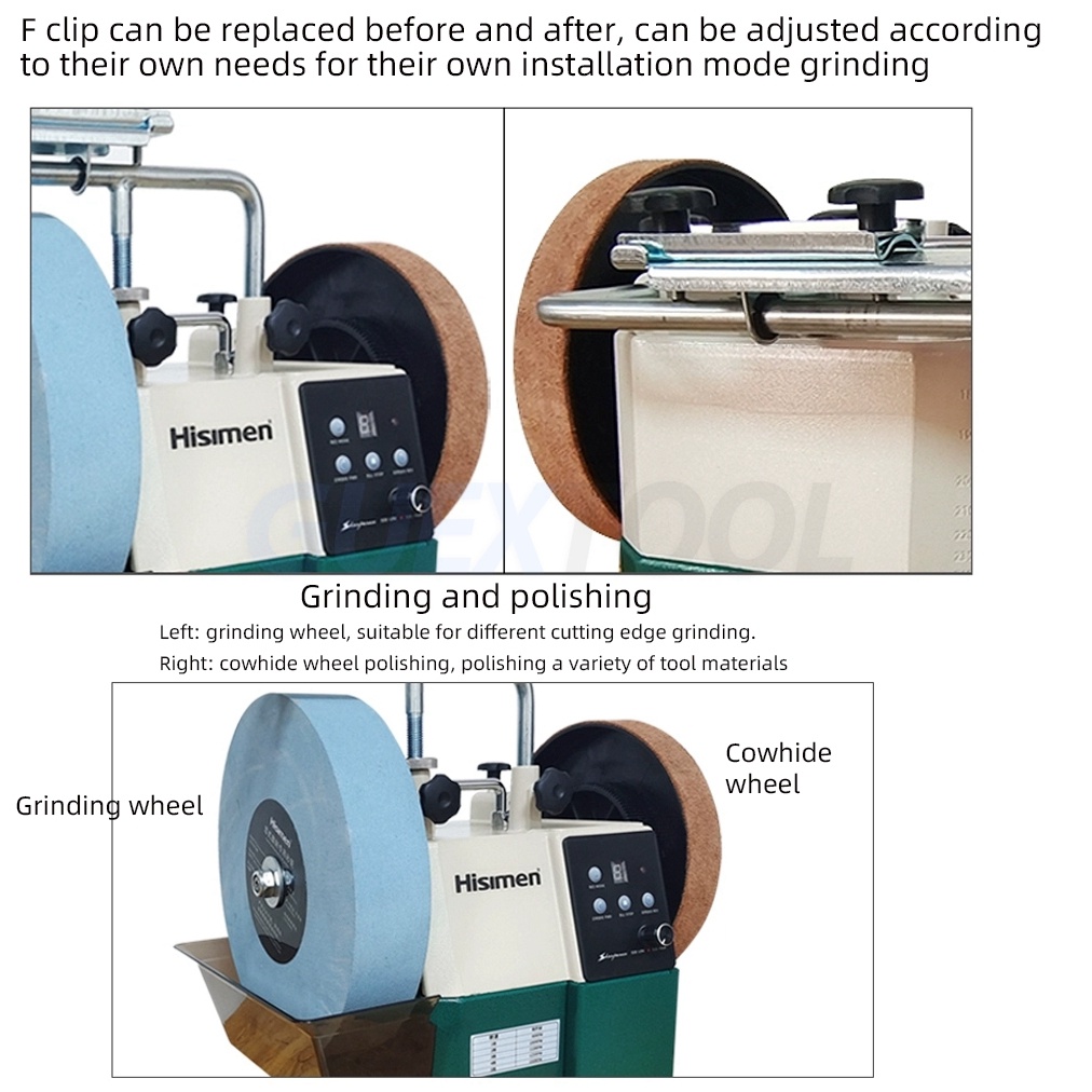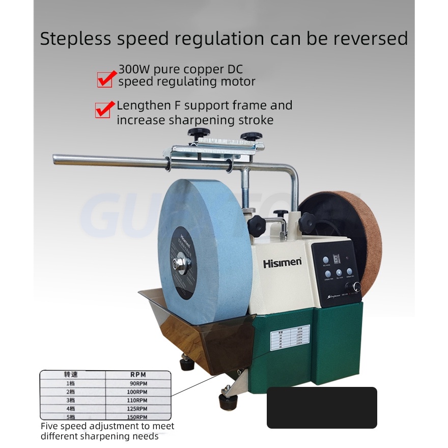 Motor type :220V/50HZ Speed control mode: DC speed control Motor power :300W Grinding wheel size: 250X50X φ12mm Grinding wheel speed: 90-150 RPM Cowhide wheel size: 200X30X Φ12.5mm Cooling method: water cooling Machine size: 515x270x400mm Net/gross weight: 14.5kg Package size: 395x335x390mm